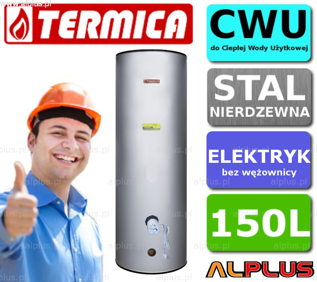 Bojler elektryczny nierdzewny TERMICA 150L pionowy stojący, 3kW (1 grzałka 3kW lub inne do wyboru), 150 litrów, 148,5cm x 54cm, Klasa energetyczna C, Wysyłka gratis