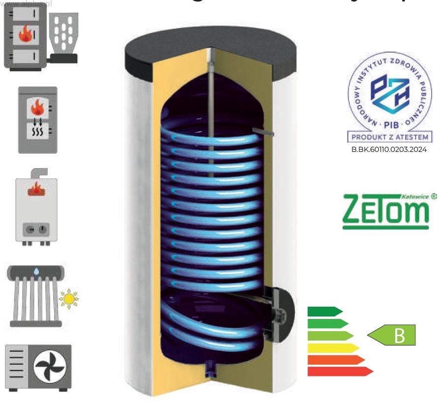 - Zastosowanie: do podgrzewania ciepłej wody użytkowej (CWU) poprzez wężownicę (która spełnia funkcję wymiennika ciepła) i opcjonalną grzałkę elektryczną. Ze względu na dużą powierzchnię wężownicy może być używany z pompami ciepła, ale również z każdym innym źródłem ciepła (kotłem na drewno, gazowym, węglowym, kolektorami słonecznymi itd)